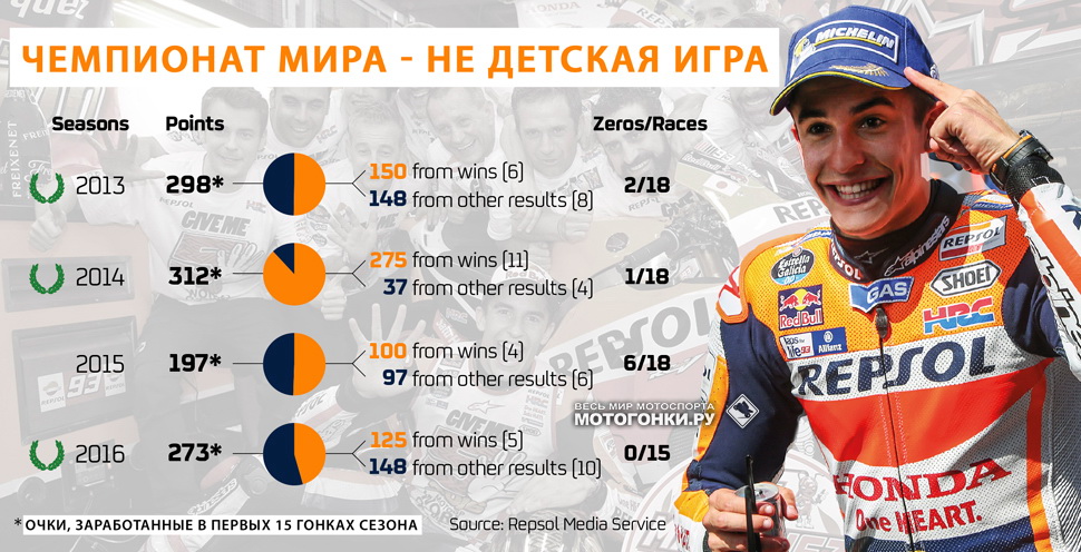 За 15 гонок с начала года Маркес не допустил ни одной ошибки, которая могла бы привести его к падению или потере очков. Он не брал побед гонку за гонкой, позволяя другим иногда забирать золото. Но он все равно стал чемпионом досрочно, как и в 2014 году — в Twin Ring Motegi. Пусть это и стало неожиданным «подарком» от пилотов Yamaha Factory (сход обоих — Росси и Лоренцо), Маркес добился результата, регулярно включая голову. Пусть статистика показывает, что теперь в его копилке меньше «золотого песка» — только 125 из 273 очков, зато он пополнял казну в каждой гонке, не упуская ни одного шанса сделать это!